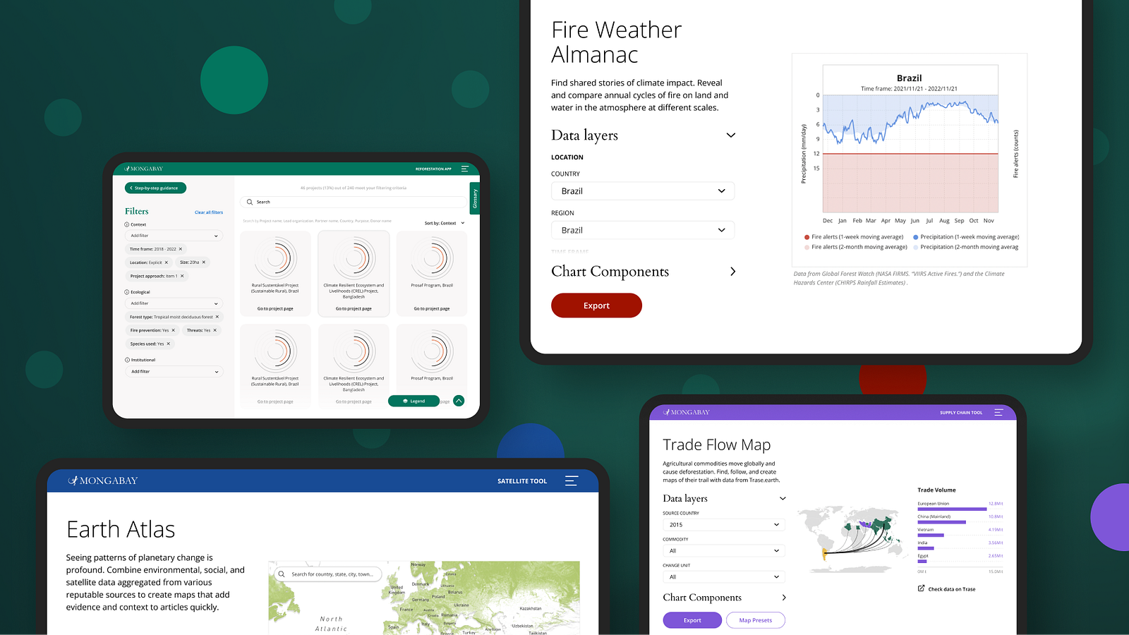 Drawing upon our extensive experience designing and developing data-rich platforms, we simplified data and satellite imagery integration for journalists while collaborating with Mongabay to create a comprehensive directory highlighting successful reforestation initiatives worldwide. Prioritizing quality data with user experience resulted in a suite of publication-ready maps to ground reporting and storytelling in data.