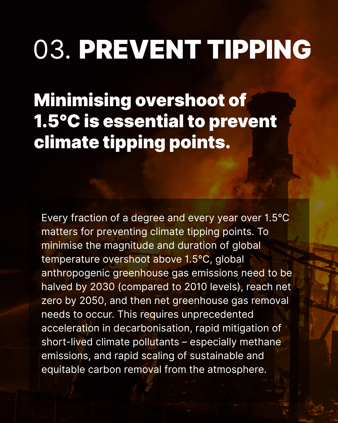 These tipping points are far more than a scientific analysis of our earth; they are human and non-human rights issues. This affects all of us. Every 0.1°C is more threatening and a consequence of the system we live in, of the decisions to prioritise fossil fuels, resource extraction, profit, and militarisation on a global scale. A result of countries in the Global North overshooting their fair share of emissions and natural resources for a long time.