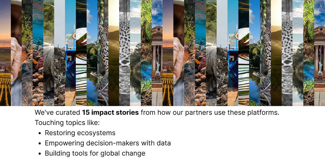 Have we been part of your journey? Whether through direct collaboration or by using one of our platforms, we want to hear your impact story. How has our work together contributed to empowering people, safeguarding nature, or combating climate change? Your experience could inspire others and help shape the future of data-driven sustainability solutions.